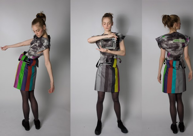 As for the photos, these are from Divya Raman's label FMCG (Fast Moving Consumer Goods), particularly from the (absolutely brilliant) 'Tele-commandments for a cathodic soul' collection. Whilst Divya graduated with her MA in Digital Fashion from London College of Fashion in 2008, it seems that she is rather a household name (at least in some households), in part because of her stint as a finalist on Project Runway India in 2006, and her previous experience as a designer for international brands. At any rate, no matter how familiar you are with Divya or her past/current projects, there is no denying that you've never seen television, religion, and art brought together just like this...